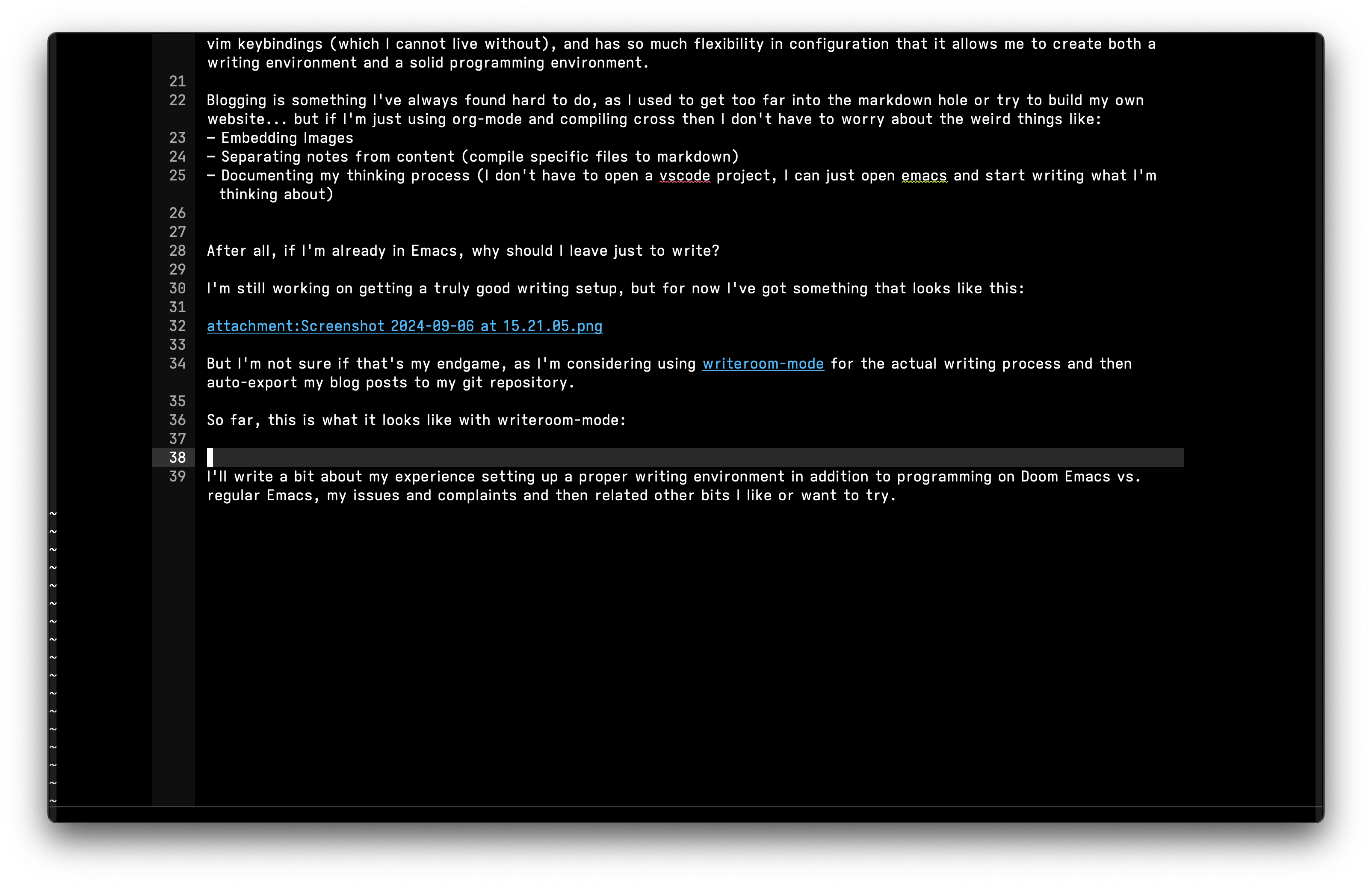 Emacs as a tool is incredibly versatile, with endless configuration options and extensibility through elisp, but one thing I’ve not seen up until recently was using it to write.